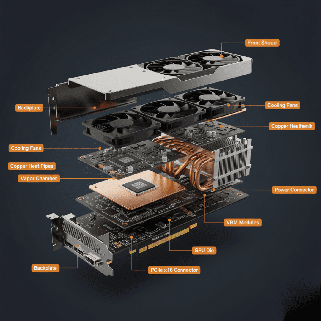 The layered construction improves heat dissipation, protects critical components, and ensures long-term reliability. From the silicon core to the cooling assembly, every element plays a vital role in maximizing graphical performance and system stability.