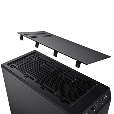 The Pure Base 600 top cover is adjustable allowing choice between boosting your system’s cooling or silence. You can close it for more silence, open it partially for more exhaust or leave it open to mount a water cooling radiator.