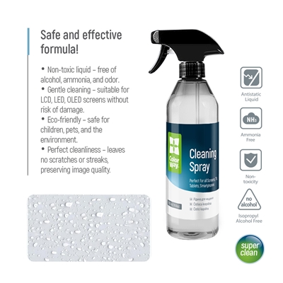 The ColorWay cleaning kit is perfect for gently cleaning all types of screens: TVs, monitors, tablets, laptops, and smartphones. It effectively removes dust and grease from various electronic devices without leaving streaks, residue, lint, or static. The non-toxic, safe liquid is alcohol-free, ammonia-free, and odorless, making it completely safe for screens of all types, including LCD, LED, and OLED displays. It is also safe for children, pets, and does not harm the environment. This product cleans effectively without scratching or leaving streaks, ensuring excellent image quality without damaging surfaces. The kit includes two microfiber cloths that gently clean and polish screens to a shine. The spray bottle design prevents leaks and accidental spraying. Two different cloths ensure more thorough cleaning.