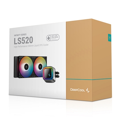 The DeepCool LS520 premium liquid CPU cooler maximizes cooling performance and low-noise efficiency with a 240mm radiator, two FC120 A-RGB PWM fans, and an infinity mirror cap design.