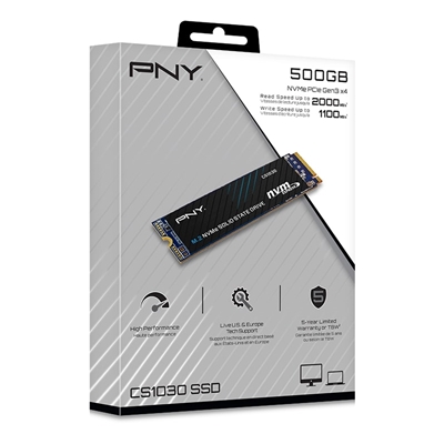 PNY (M280CS1030-500-RB) CS1030 M.2 NVMe 500GB SSD, PCIe Gen3 x4, Sequential Read of up to 2,000 MB/s and Write of up to 1,100 MB/s