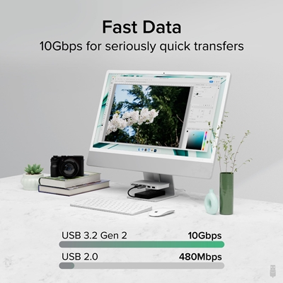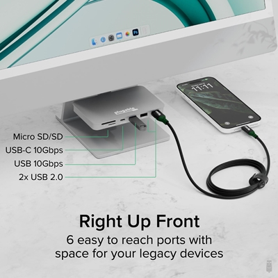 Quit fumbling around back there. This iMac USB hub brings easy access to 6 of the most commonly used ports, 1x USB-C (10Gbps), 1x USB-A (10Gbps), 2x USB 2.0, and SD and Micro SD card readers, all suspended beneath your screen for quick connections