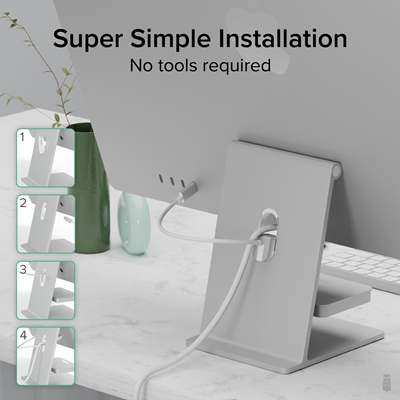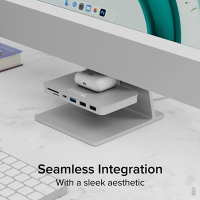 Simply clip the mounting ring into the cable cutout, then hook on the 6-in-1 hub and connect it to a USB C port on the back of the iMac 24 inch. Installation only takes a few seconds and the hub has a sleek, floating appearance