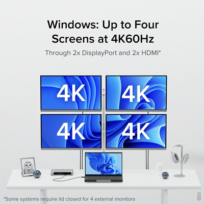 Go big with up to 4x screens up to 4K 60Hz on Thunderbolt 4 Windows systems. With 7x USB, SD / microSD slots, Ethernet (2.5Gbps), audio, and 100W PD to keep you charged, your Windows laptop will have plenty to power your productivity