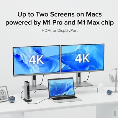 Add up to 4x 4K 60Hz screens to a Windows Thunderbolt 4 laptop 2x HDMI, 2x DisplayPort. Mac (Intel, M1 / M2 / M3 Pro/Max CPU), connect up to 2x 4K 60Hz screens through HDMI DisplayPort or one of each. (Only one external screen on base M1 / M2 / M3 Mac)