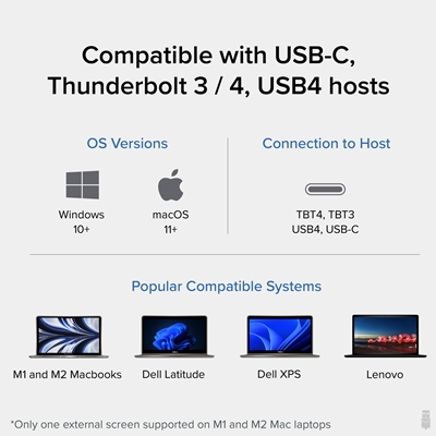 Compatible with Windows 10 or later and macOS 11+. This quad monitor dock connects to Thunderbolt 4, Thunderbolt 3, USB4, and USB-C via included Thunderbolt 4 cable (40Gbps, 3.3ft/1m).