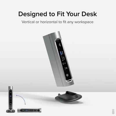 The Thunderbolt Certified 16-in-1 Quad docking station from Plugable delivers peak performance. The innovation starts with our display connections. Connect your 4K screens through 2x HDMI ports and 2x DisplayPort ports — a rare level of display flexibility in a Thunderbolt dock. But the real expansion picks up at the ports. Offering sixteen total ports to park your peripherals, including 7x USB ports, SD and microSD card readers, Audio, and 2.5Gbps Ethernet. It even adapts to your desk with an included stand for vertical or horizontal orientation options.