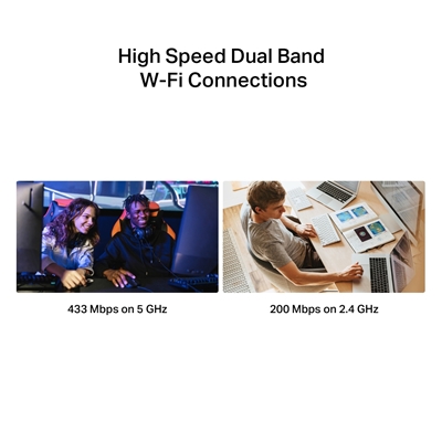 Speeds up to 433 Mbps (5 GHz) + 200 Mbps (2.4 GHz)