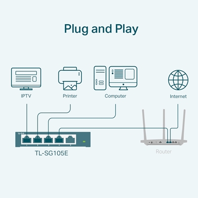 TL-SG105E is easy to use and manage. Auto MDI/MDI-X crossover on all ports eliminate the need for crossover cables or uplink ports. Auto-negotiation on each port senses the link speed of a network device (either 10, 100, or 1000 Mbps) and intelligently adjusts for compatibility and optimal performance. Its compact size makes it ideal for desktops with limited space while also being Rack-mountable, convenient and safe. Dynamic LED lights provide real-time work status display and basic fault diagnosis.