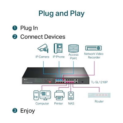 The TL-SL1218P is fully compatible with PoE devices, such as IP cameras, access points, and IP phones. It also works with non-PoE wired devices, such as PCs, printers, and IPTV.