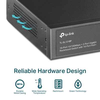 TP-Link TL-SL1218P 16-Port Metal 10/100 Mbps + 2-Port Gigabit Rackmount PoE Switch with 16-Port PoE+ (150W)