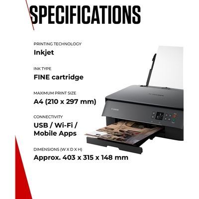 | Packaging content | PIXMA TS5350i Inkjet Printer, Black FINE cartridges Sample of 3x high quality 13 x 13 cm PP-201 photo paper |